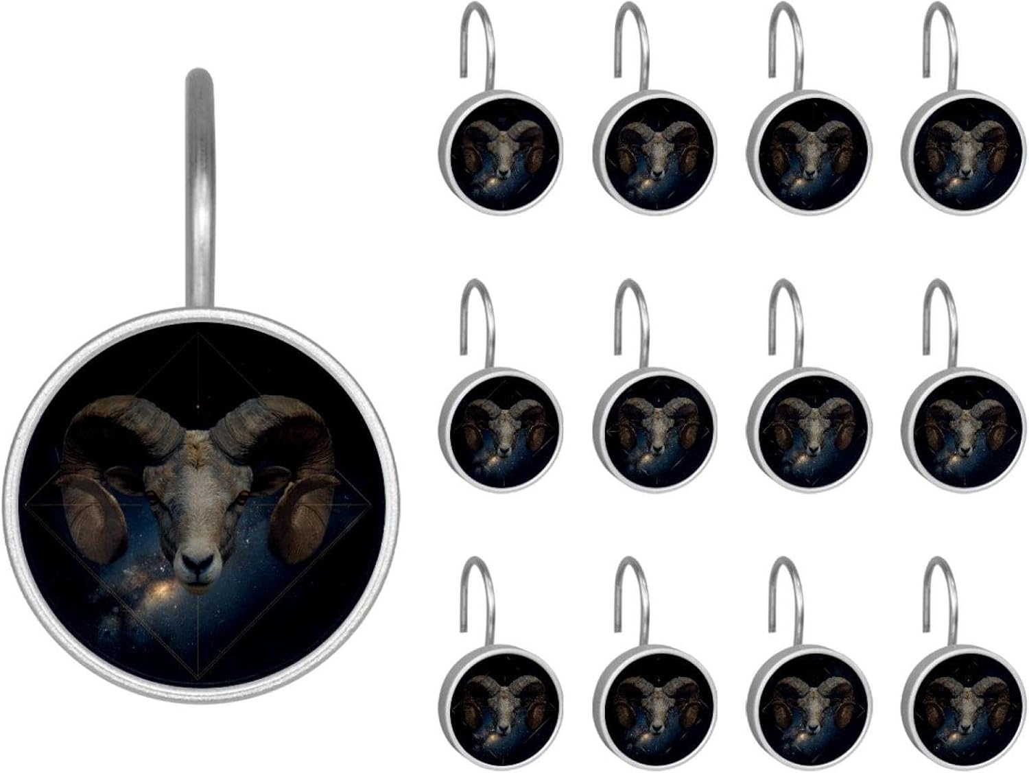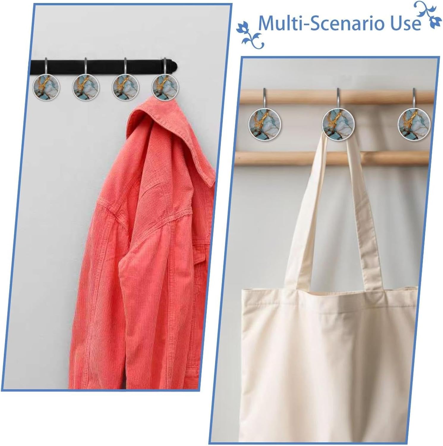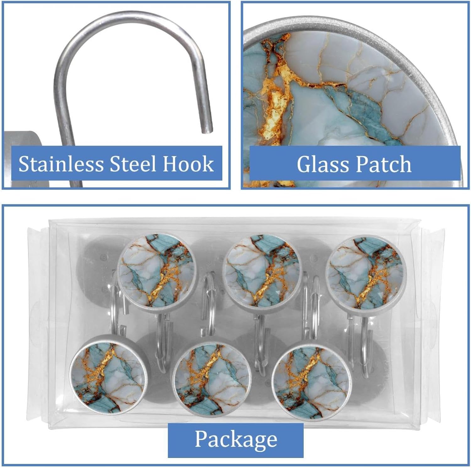 MATERIAL: glass, stainless steel. These shower curtain hooks can be decoration bathroom and will be long-lasting.12 pieces of shower curtain hooks, round crystal glass decoration, printed patterns, silver hooks to match various styles of bathroom shower curtains. SIZE: Crystal glass diameter of round shower curtain hook is 1.45x1.45in/ 3.7x3.7cm. The shower curtain hooks diameter is about 1.1in, 12 pieces shower curtain hooks are suitable for rod of 8-28mm(0.3"-1.1"). RUST RESISTANT:Shower hooks are made of stainless steel and crystal glass, which is durable, rust-proof and corrosion-resistant, it will not rust suitable for wet bathroom environment. EASY TO INSTALL:Hand the shower curtain hooks hold securely on straight or curved shower curtain rods,slid easily and smoothly. Easy to install and decorate your bathroom. BEAUTIFUL AND ELEGANT:Beautiful Love hook add charming scenery for your bathroom, baby room, bedroom, living room, and the gorgeous style is easy to match with any kinds of bathroom shower curtain. EASY GLIDE: Open and close your shower curtain quickly and easily with the Shower Hooks, easily glides on shower curtain rods and tension rods. No snagging; no effort; no hassle PACKAGE: 12 shower curtain hooks in a pack.The bathroom curtain hook has a smooth appearance and can be hung on the pole to pull it at will. Special price 12 sets to meet your needs.