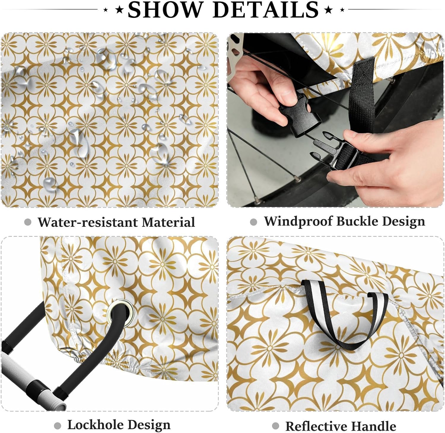 Protect your bicycle in style with our premium bike tarp, engineered for maximum defense against harsh elements. Unlike basic covers, we use specially engineered umbrella waterproof fabric - the same advanced material used in high-end rain umbrellas - delivering superior performance with unique visual appeal. Sun & Heat Defense Our fabric creates a physical cooling barrier that actively lowers your bike's temperature by: Blocking 95%+ harmful UV rays to prevent paint fading Providing exceptional shading & heat insulation (up to 20℉/11℃ reduction vs direct sun) Offering SPF 50+ equivalent protection for sensitive components Rain & Dust Protection Water-repellent coating causes rain to bead and roll off Tightly woven fabric acts as dustproof barrier for long-term storage Prevents moisture buildup with breathable side panels (prevents condensation) User-Focused Design LOCK ACCESS HOLE at front wheel enables secure locking without removing cover ADJUSTABLE BUCKLE STRAP at rear wheel anchors cover during strong winds Reflective safety strips on handles enhance nighttime visibility Ultra-lightweight (23 oz) folds into included pouch Unbeatable Aesthetics Choose from over 1,000 designer patterns - from sleek geometrics to vibrant nature motifs - transforming your bike into a street-style statement while competitors offer only solid colors.