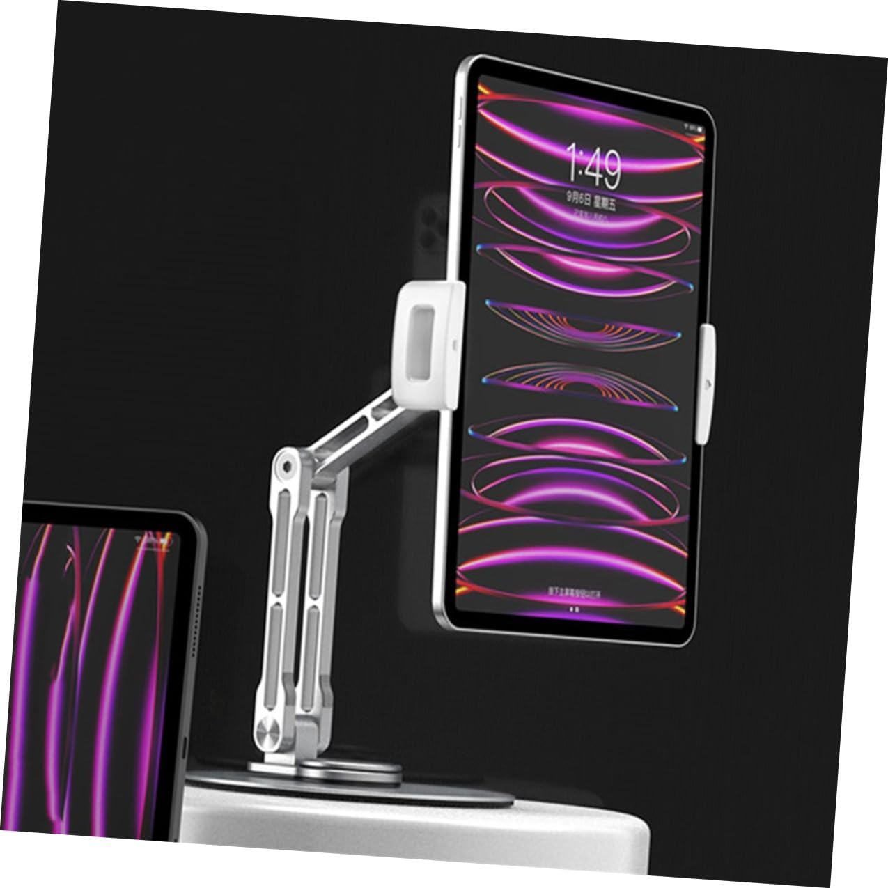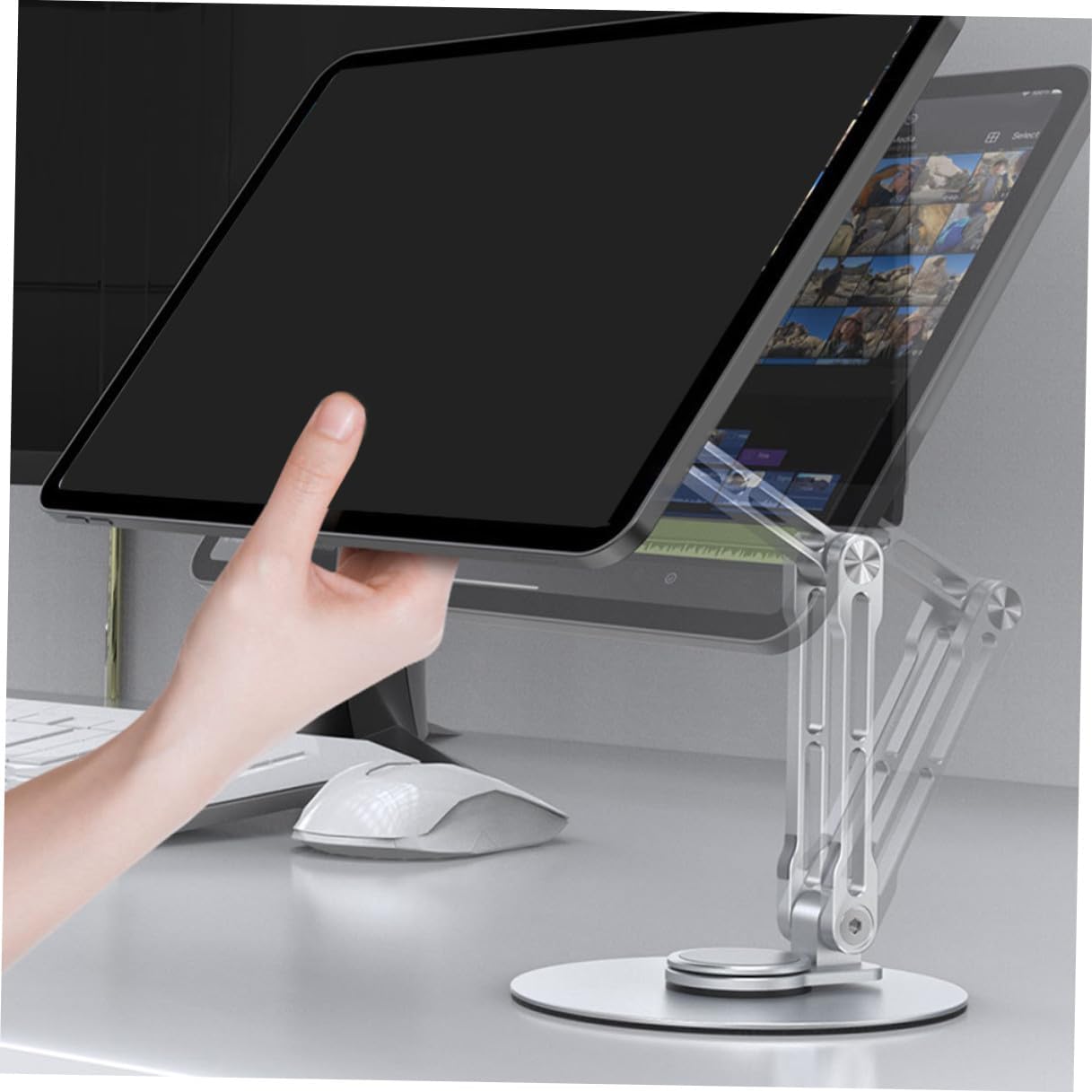 Package Include 1 x Tablet Holder Features -Clamp adjustable range: 13.5-26.5cm/5.31-10.43in tablet mount for desk - Color: Silver - Size: 26.00X11.50X11.50cm/10.22X4.52X4.52in -Material:ABS, aluminum alloy, silicone -Product Info:Aluminum alloy flat plate bracket - Lightweight and compact in size, easy to be placed stably on a flat and smooth surface. - The tablet holder can be given as a good to your friends, which makes them feel happy all the time tablet holder for room. - The tablet stand is durable and practical enough to use. You can adjust the tablet holder angles for your different needs compact desktop tablet holder. - Put your tablet or another device at the perfect angle to enjoy a better using experience adjustable tablet stand. - workmanship, reasonable structure, professional and practical, can bring you convenience folding tablet holder.Goods Descriptiontablet stand adjustable Suitable for working at office, home, restaurant and more.foldable tablet stand This stand provides a nice compact place for tablet.tablet stand for desk Made of ABS, aluminum alloy, silicone material, durable and practical for long-term use.desktop tablet holder Fashionable design, make it suitable for any home decoration style