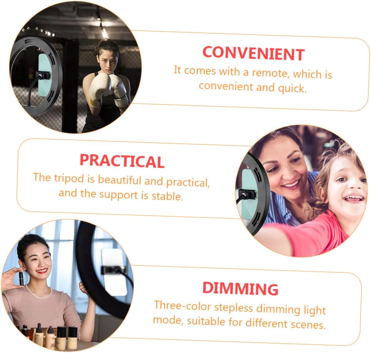 Package List 1 x fill light 1 x tripod head 1 x iron stand 1 x shutter Features -Color Temperature: 3000-6500K. -Size: About 39.00X25.50X18.00cm/ 15.33X10.02X7.07in. -Material: Plastic, Iron. -Voltage: 5V cell phone holder. -Color: Black. -Light Source Power: 8-10W tripod for cell phone. -Light Source Type: 2835 LED mobile phone selfie fill light bracket. -Product Info:Fill light bracket - The tripod is beautiful and practical, and the support is stable mobile phone tripod stand. - It comes with a remote, which is convenient and holder for filming. - USB power supply, multi-functional integrated molding, such as beauty, skin brightening, light supplement, etc phone stand tripod. - Three-color dimming light mode, suitable for different scenes. - The ring light connection clip can be placed on the mobile phone, and the horizontal and vertical screens can be switched freely live mobile phone bracket.Goods Descriptiontripod for phone With light filling function, it is perfect for live broadcasting.phone stand tripod It comes with a remote, which is convenient and quick.phone stand for live Fine workmanship and details.live mobile phone bracket This mobile phone holder is made of and is durable