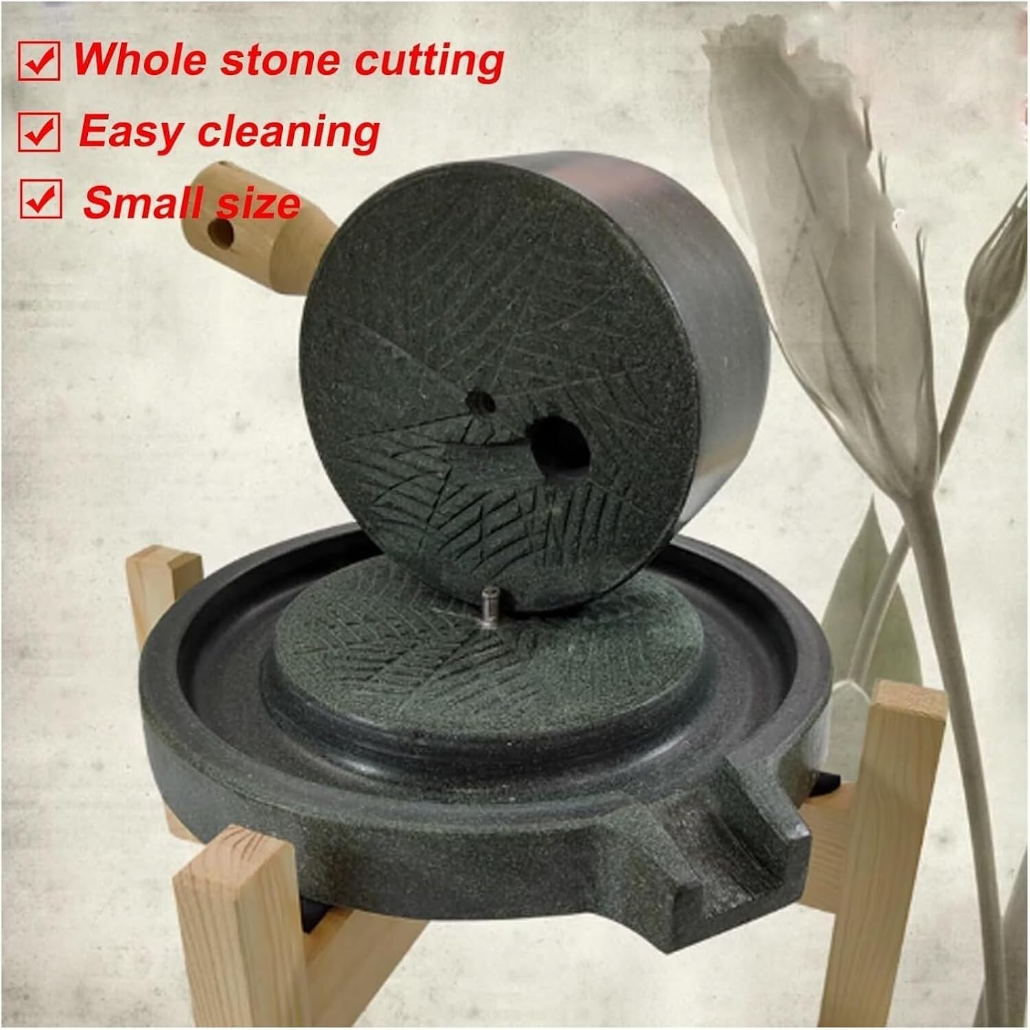 Introducing our Stone Grain Mill, a perfect addit for those who appreciate the art of tradital grain grinding at home. Crafted from high-quali granite, this hand-operated mill not only preserves the nutrital value of your grains but also enhances the for of your favorite recipes. Whether you are making fresh flour for ing, preparing meal for your family, or looking to enjoy the wholesome goodness of hemp seeds, this handmade mill is designed to meet your needs. With a sturdy wooden e, our grain mill provides stabili during use, ering a smooth grinding experience. The upper disc ures 13 cm (5.7 in) in diameter, while the lower disc is 20 cm (7.9 in), allowing for efficient grinding of various grains. The cact height of 15 cm (5.9 in) makes it easy to store in your kitchen without taking up much space. For optimal performance, it’s important to ere your worktop is level and securely fixed during installat. This prevents any movement while grinding, allowing you to fully enjoy the ps. We recommend applying moderate force when turning the handle and maintaining a steady pace to achieve the best results. Avoiding excessive twisting will help preserve the integri of the wooden conents. We understand that customer satisfact is paount. Should you encounter any issues or have quests, our dcated after-sales service team is here to assist you. We are committed to resolving any concerns you may have, ering a delightful experience with your Stone Grain Mill. Transform your cooking and ing with the wholesome goodness of freshly ground grains. Make our Stone Grain Mill your go-to kitchen can today!