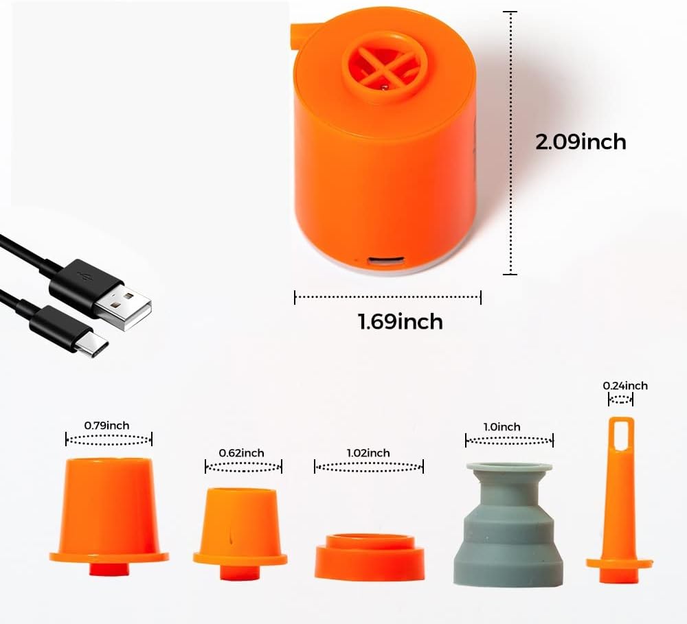 Product Name: Outdoor Air PumpMaterial: ABSSize: 43*43*53mmV: 13.5wInflation speed: 180L/MinInflation pressure: 3.5kpaInspiratory pressure: 3kpaPower: 1300mAhCompression ratio: 50%Accessories: with 5 gas nozzlesBrightness/use time: 40lm/10hrs, 160lm/2.5hrs, 400lm/1hrsLight Color: 4500k WhiteApplicable objects: inflatable neck pillows, swimming rings, inflatable cushions, inflatable beds, yoga balls, inflatable toysPacking list: 1*air pump, 5*different gas nozzlesNote:1. Before placing an order, please notice that the item color and grain displayed in the pictures may be slightly different from the real object,2. Since the size above is measured by hand, the size of the actual item you received could be slight different from the size above.