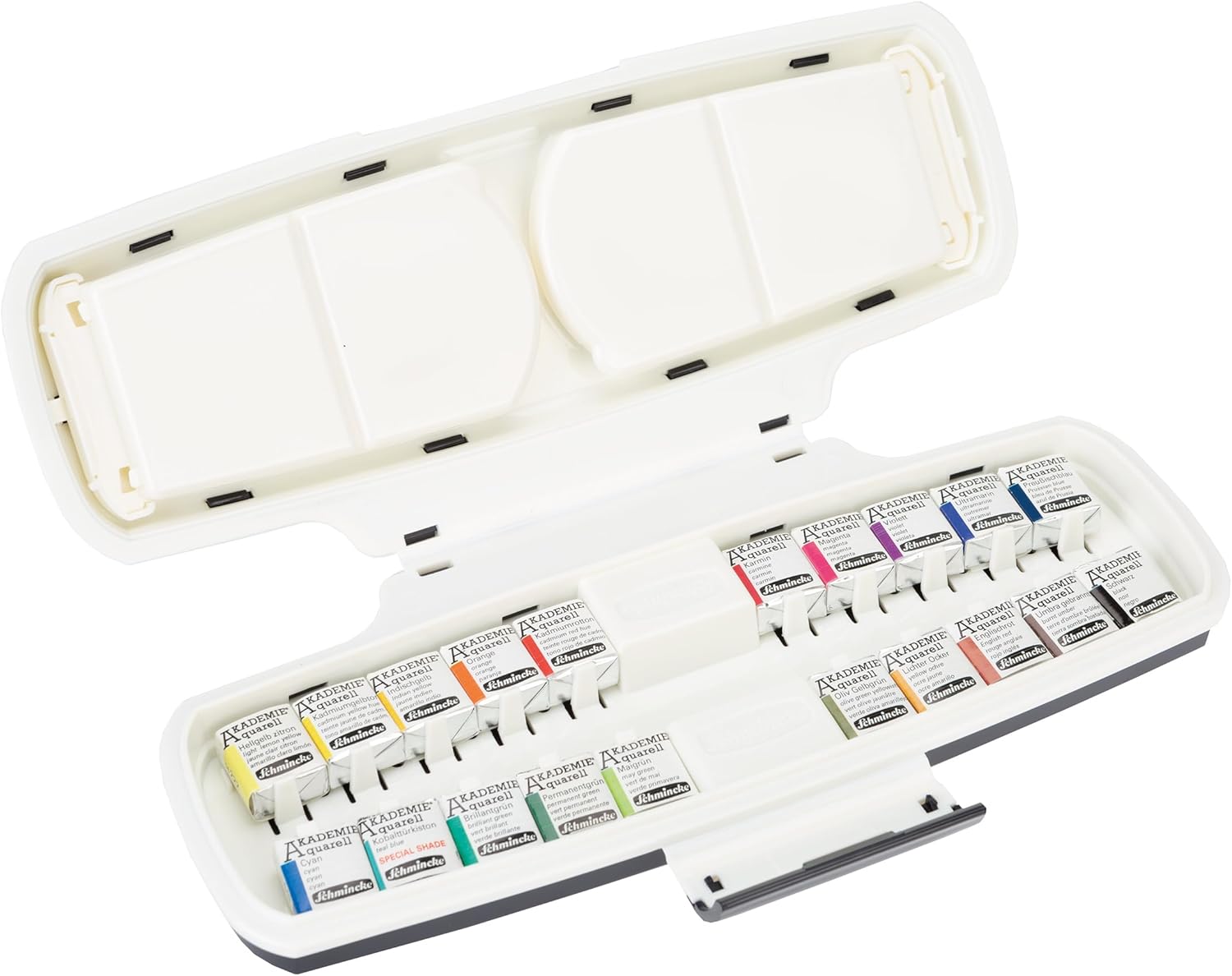 Schmincke Akademie Aquarell Watercolors deliver professional results at an accessible price. The range includes meticulously milled, liquid-poured colors that activate instantly. Strongly pigmented, Schmincke has removed toxic and expensive pigments without compromising the brand’s renowned quality standards. - Schmincke Akademie Aquarell Watercolor Pans - Set of 20, Plastic Case, Half PansAkademie Aquarell wc, PLSTC ST 20 HALF PNS - This specially designed capsule set contains 20 half pans, including a special-edition Teal that mimics Cobalt Turquoise with a non-toxic blend of Phthalo Green and Phthalo Blue. Housed in a sleek plastic box with a deep blue finish, it features ample mixing space in the lid and fold-out trays for travel and outdoor painting. Colors include Light Lemon Yellow, Cadmium Yellow Hue, Indian Yellow, Orange, Cadmium Red Hue, Carmine, Magenta, Violet, Ultramarine, Prussian Blue, Cyan, Teal Blue, Brilliant Green, Permanent Green, May Green, Olive Green Yellowish, Yellow Ochre, English Red, Burnt Umber, and Black.