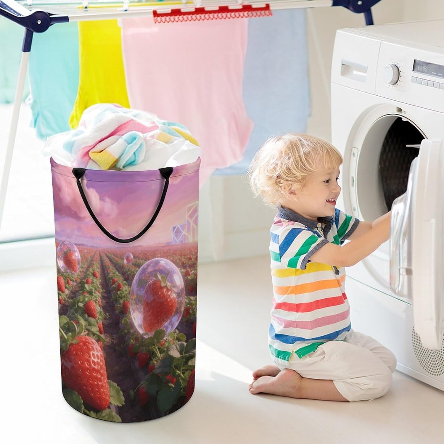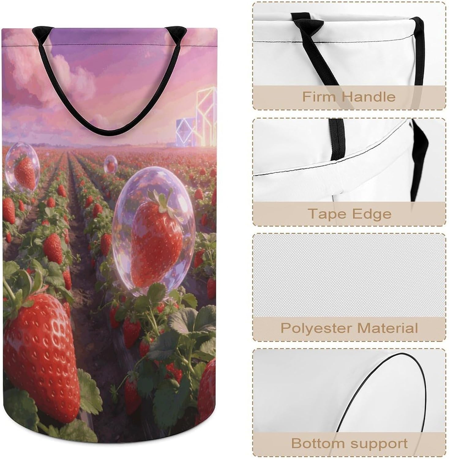 The pattern of the Strawberry Fields hamper is printed with exquisite patterns, which makes the product more attractive.Chic design allows it to be used in the living room to hold throw blanket, pillows, and reading materials, as well as in the bathroom for towels, or as a laundry hamper.The laundry hamper adopted collapsible design, equipped with handles. It is lightweight and portable for using, storing, and moving conveniently.Strawberry Fields Clothes hamper is suitable to store dirty clothes washing, place in the room to store toys, and other household goods, keep the house clean and tidy. Perfect laundry hamper for home, office, closet organizer, bedroom, bathroom, college dorm, etc.Gets out of your way when you need it to. This storage basket or laundry hamper is a good gift, which not only meets everyday storage needs but also carries deep care and love, a perfect way to turn thoughtfulness into warmth.